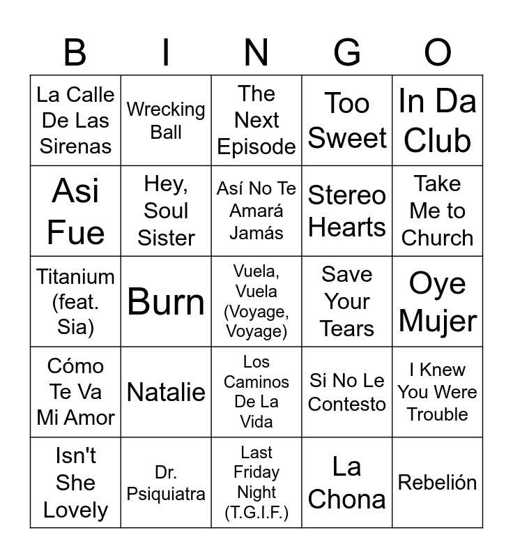This bingo card has 103 words: Summertime Sadness, SexyBack (feat. Timbaland), In Da Club, Ms. New Booty, Stumblin' In, A Ram Sam Sam, Chuchuwa, Five Little Speckled Frogs, The Wheels On The Bus, PAM, Bingo, Ella Me Levantó, Si No Te Hubieras Ido, Borro Cassette, Hawái, Give Me One Reason, The Next Episode, Still D.R.E., Gangsta's Paradise, Regulate, No Diggity, Cake By The Ocean, Be the One, Wicked Games, Don't Stop the Party (feat. TJR), Natalie, Take Me to Church, Too Sweet, Abusadora, Rakata, Si No Le Contesto, La Chona, La Vaca, Quítame Ese Hombre Del Corazón -, La Noche Que Murio Chicago, El Gran Varon, Te Quedó Grande La Yegua, Todos Me Miran, Así No Te Amará Jamás, Dr. Psiquiatra, Quién Como Tú, Cómo Te Va Mi Amor, Como Tu Mujer, Asi Fue, Pelo Suelto, La Calle De Las Sirenas, El Chico Del Apartamento 512, Vuela, Vuela (Voyage, Voyage), Chuy Y Mauricio, Rebelión, La Puerta Negra, La Vida Es Un Carnaval, Rata De Dos Patas, Simplemente Amigos, A Dios Le Pido, El Color de Tus Ojos, Turn The Lights Off - Radio Edit, Como La Flor, Vivir Mi Vida, Los Caminos De La Vida, Oye Mujer, Tao, Tao, Pray, Two Wooden Beams, IN THE ROOM, La Fila, All of Me, Wrecking Ball, Titanium (feat. Sia), Burn, Last Friday Night (T.G.I.F.), Young And Beautiful, Talking to the Moon, Easy On Me, My Girl, Ain't No Mountain High Enough, Lean on Me, Isn't She Lovely, Diamonds, Empire State Of Mind, Where Is The Love?, I'm Yours, Hey, Soul Sister, Counting Stars, Save Your Tears, a thousand years, Macarena, Stand By Me, Hey There Delilah, Replay, Airplanes, Dynamite, I Knew You Were Trouble, Teenage Dream, Heart Attack, Whistle, Stereo Hearts, Beautiful Girls, Beauty And A Beat, Fireflies, Smack That, Crank That (Soulja Boy) and Listen To Your Heart.