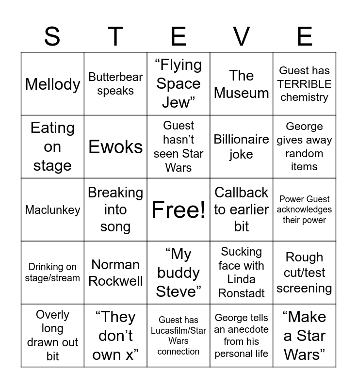 This bingo card has a free space and 43 words: Detours mention, “Make a Star Wars”, Patrick slander, Overly long drawn out bit, Butter Boy/Girl, George tells an anecdote from his personal life, “Flying Space Jew”, Guest has great chemistry, Guest has TERRIBLE chemistry, “They don’t own x”, The Museum, Callback to earlier bit, “My buddy Steve”, Norman Rockwell, Mention of George’s “loss”, Guest has Lucasfilm/Star Wars connection, George smashes something with a hammer, Maclunkey, Surprise guest, George gives away random items, Butterbear speaks, Watto cup, Bad pun, Mellody, Priceless, Power Guest acknowledges their power, Reference to another Lucasfilm production, Joke about prequels coming out first, Sucking face with Linda Ronstadt, Drinking on stage/stream, Watto channels Griffin Newman, Rough cut/test screening, Technical difficulty, Breaking into song, Diabetes, Howard the Duck, Patrick forgets to bring something, Guest hasn’t seen Star Wars, Eating on stage, Billionaire joke, Guest name drops celebrity, Ewoks and No Our Guests/Power Guest chant.