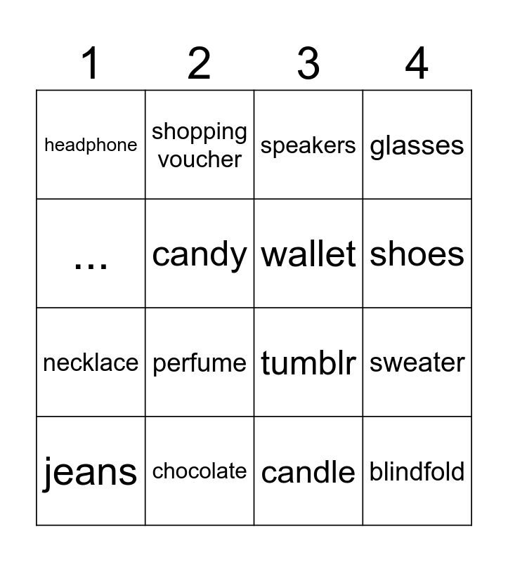 This bingo card has 16 words: chocolate, sweater, speakers, headphone, necklace, shopping voucher, tumblr, candle, ..., candy, jeans, glasses, perfume, shoes, wallet and blindfold.