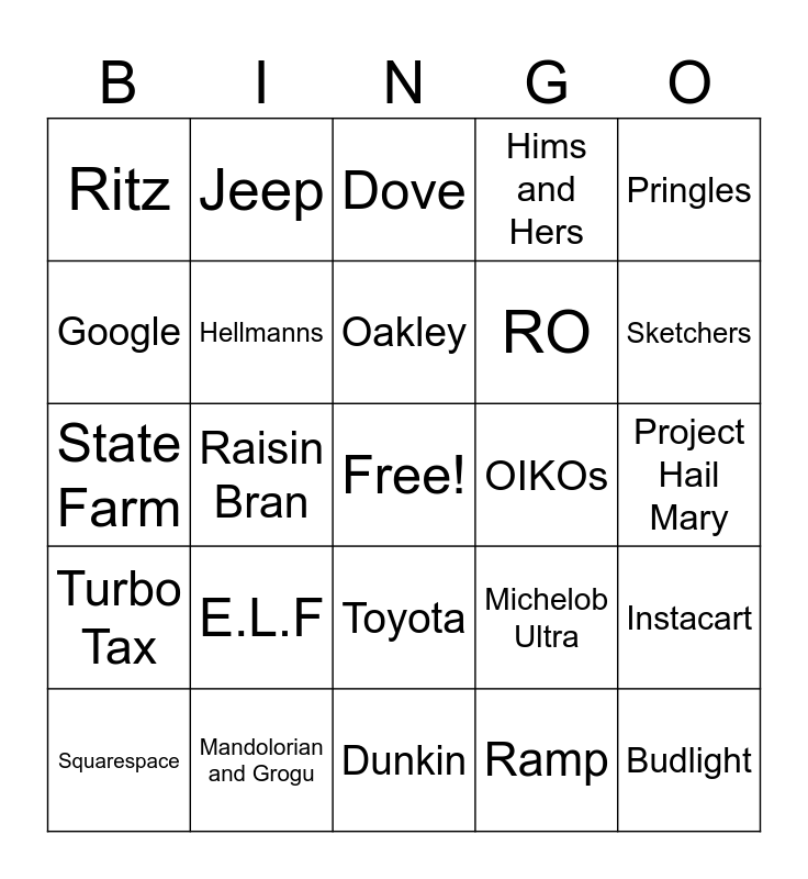 This bingo card has a free space and 49 words: Bosch, Budlight, Budweiser, Dunkin, E.L.F, Expedia, Jeep, Fanatics, Google, Grubhub, Hellmanns, Hims and Hers, Instacart, Michelob Ultra, Nerds, Novartis, Oakley, OIKOs, Pepsi, Pringles, Raisin Bran, Ramp, Ritz, RO, Rocket, Sketchers, Squarespace, Svedka, Toyota, Turbo Tax, Universal Orlando, Six, Scream 7, Michael, Mandolorian and Grogu, Super Mario, Hoppers, Toy Story 5, Project Hail Mary, Minions Movie, Disclosure Day, Manscaped, Lays, Liquid IV, State Farm, Dove, Uber Eats, Kinder and Clydesdales.