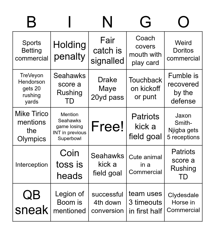 This bingo card has a free space and 37 words: Colinsworth says "Here's a guy", Seahawks score a Passing TD, Patriots score a Passing TD, Seahawks score a Rushing TD, Patriots score a Rushing TD, Coin toss is heads, Drake Maye 20yd pass, Sam Darnold gets sacked, Weird Doritos commercial, Someone is compared to Mahomes, Mention Seahawks game losing INT in previous Superbowl, Coach covers mouth with play card, Clydesdale Horse in Commercial, Jaxon Smith-Njigba gets 5 receptions, TreVeyon Hendorson gets 20 rushing yards, Interception, Snoop Dog is in a Commercial, Fair catch is signalled, Seahawks kick a field goal, Patriots kick a field goal, Sports Betting commercial, Fumble is recovered by the defense, QB sneak, successful 4th down conversion, Cardi B appears at Halftime, team uses 3 timeouts in first half, Holding penalty, Patriots leading at the end of the first half, Mike Vrabel shown during national anthem, Tight end scores a TD, Famous Actor shown in the crowd, Legion of Boom is mentioned, Mike Tirico mentions the Olympics, False Start, Cute animal in a Commercial, Touchback on kickoff or punt and Injury timeout.
