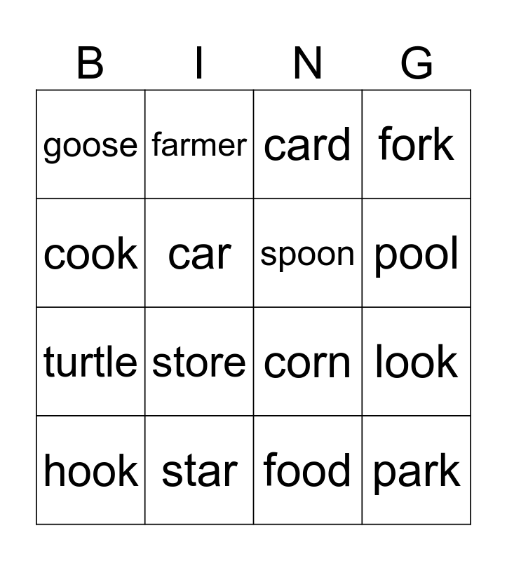 This bingo card has 27 words: nurse, purse, turtle, arm, car, card, farmer, park, star, cork, corn, fork, borse, north, store, zoo, spoon, pool, moon, goose, food, wood, look, hook, foot, cook and book.