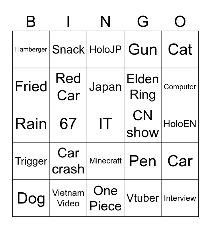 This bingo card has a free space and 24 words: Car crash, Vietnam Video, Japan, Dog, Cat, Hamberger, Fried, Snack, CN show, Minecraft, Elden Ring, Rain, Pen, Car, Red Car, Vtuber, HoloEN, HoloJP, Computer, 67, Interview, Trigger, Gun and One Piece.