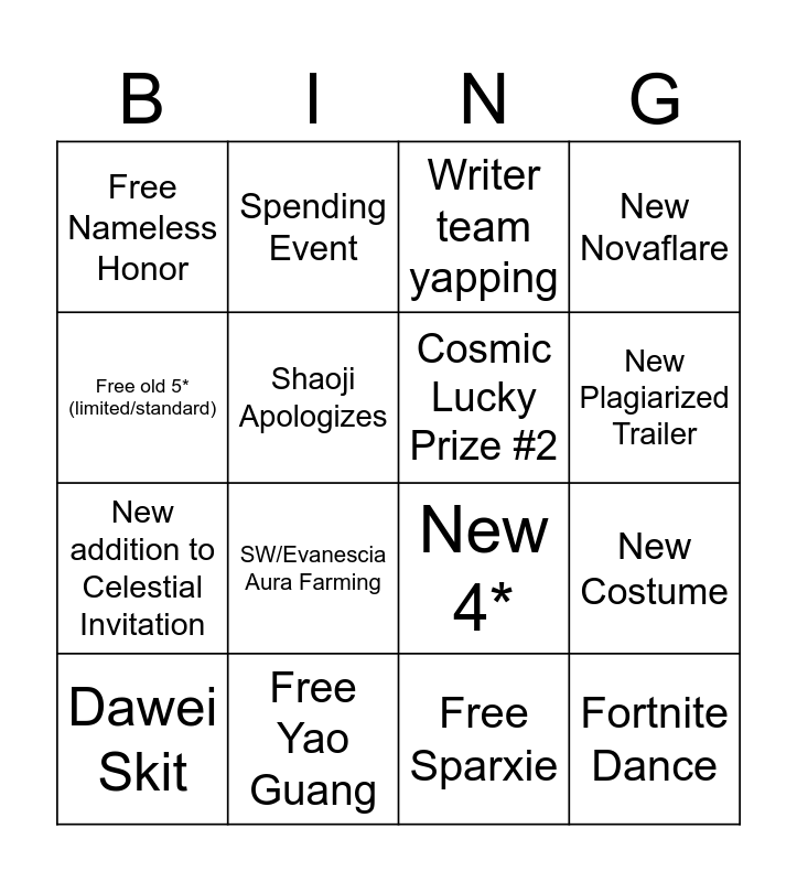 This bingo card has 16 words: Free Yao Guang, New Costume, Writer team yapping, Free Nameless Honor, New addition to Celestial Invitation, Spending Event, New 4*, Free Sparxie, Free old 5* (limited/standard), Shaoji Apologizes, Dawei Skit, New Novaflare, SW/Evanescia Aura Farming, New Plagiarized Trailer, Cosmic Lucky Prize #2 and Fortnite Dance.