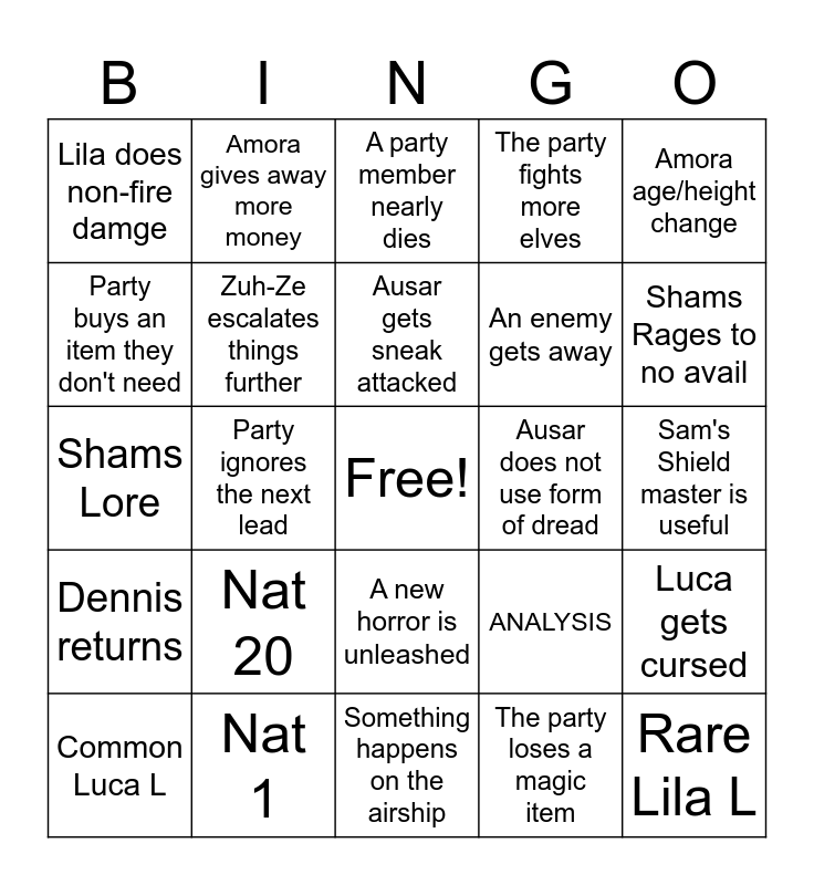 This bingo card has a free space and 24 words: Nat 20, Nat 1, Ausar gets sneak attacked, Common Luca L, Amora age/height change, Lila does non-fire damge, Party buys an item they don't need, Amora gives away more money, Ausar does not use form of dread, A new horror is unleashed, An enemy gets away, Shams Lore, ANALYSIS, Luca gets cursed, Zuh-Ze escalates things further, The party loses a magic item, Sam's Shield master is useful, A party member nearly dies, Shams Rages to no avail, Party ignores the next lead, Rare Lila L, Dennis returns, The party fights more elves and Something happens on the airship.