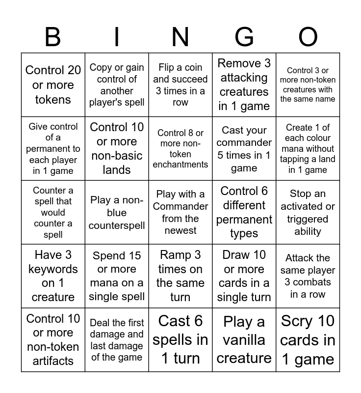 This bingo card has a free space and 24 words: Spend 15 or more mana on a single spell, Deal the first damage and last damage of the game, Control 8 or more non-token enchantments, Control 10 or more non-token artifacts, Control 3 or more non-token creatures with the same name, Control 20 or more tokens, Give control of a permanent to each player in 1 game, Copy or gain control of another player's spell, Control 6 different permanent types, Ramp 3 times on the same turn, Cast your commander 5 times in 1 game, Counter a spell that would counter a spell, Draw 10 or more cards in a single turn, Attack the same player 3 combats in a row, Control 10 or more non-basic lands, Play a vanilla creature, Stop an activated or triggered ability, Flip a coin and succeed 3 times in a row, Create 1 of each colour mana without tapping a land in 1 game, Play a non-blue counterspell, Scry 10 cards in 1 game, Have 3 keywords on 1 creature, Remove 3 attacking creatures in 1 game and Cast 6 spells in 1 turn.