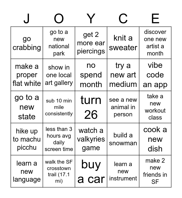 This bingo card has a free space and 24 words: less than 3 hours avg daily screen time, walk the SF crosstown trail (17.1 mi), no spend month, learn a new language, discover one new artist a month, go crabbing, make a proper flat white, go to a new national park, see a new animal in person, watch a valkyries game, try a new art medium, go to a new state, build a snowman, cook a new dish, show in one local art gallery, learn a new instrument, take a new workout class, get 2 more ear piercings, vibe code an app, sub 10 min mile consistently, make 2 new friends in SF, hike up to machu picchu, knit a sweater and buy a car.