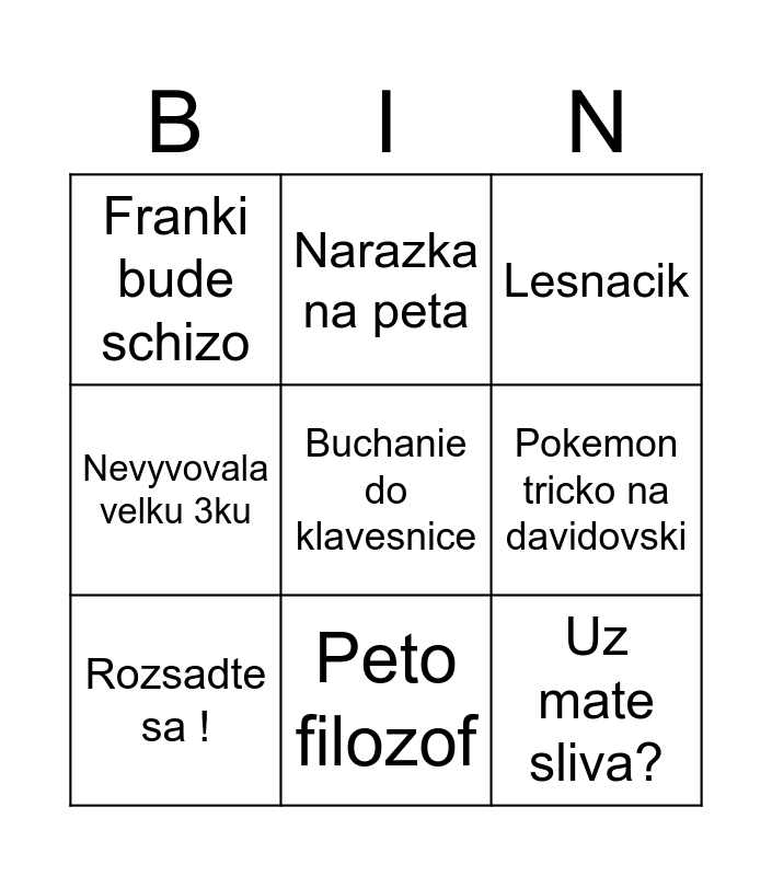 This bingo card has a free space and 8 words: Pokemon tricko na davidovski, Lesnacik, Narazka na peta, Rozsadte sa !, Franki bude schizo, Uz mate sliva?, Nevyvovala velku 3ku and Peto filozof.