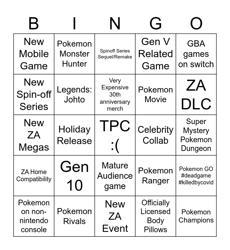 This bingo card has a free space and 24 words: Gen 10, Pokemon Rivals, Very Expensive 30th anniversary merch, Pokemon on non-nintendo console, GBA games on switch, New Mobile Game, New Spin-off Series, Pokemon Monster Hunter, Celebrity Collab, Mature Audience game, Pokemon Movie, New ZA Megas, Pokemon Ranger, Pokemon GO #deadgame #killedbycovid, Legends: Johto, Officially Licensed Body Pillows, Super Mystery Pokemon Dungeon, Spinoff Series Sequel/Remake, ZA DLC, Holiday Release, Pokemon Champions, ZA Home Compatibility, Gen V Related Game and New ZA Event.