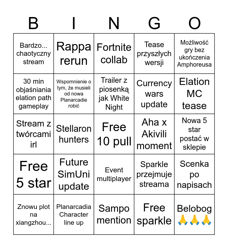 This bingo card has a free space and 24 words: Future SimUni update, Planarcadia Character line up, Trailer z piosenką jak White Night, Znowu plot na xiangzhou..., Możliwość gry bez ukończenia Amphoreusa, Bardzo... chaotyczny stream, 30 min objaśniania elation path gameplay, Rappa rerun, Aha x Akivili moment, Event multiplayer, Currency wars update, Stream z twórcami irl, Sparkle przejmuje streama, Scenka po napisach, Wspomnienie o tym, że musieli od nowa Planarcadie robić, Free sparkle, Nowa 5 star postać w sklepie, Fortnite collab, Elation MC tease, Stellaron hunters, Belobog 🙏🙏🙏, Free 5 star, Tease przyszłych wersji and Sampo mention.