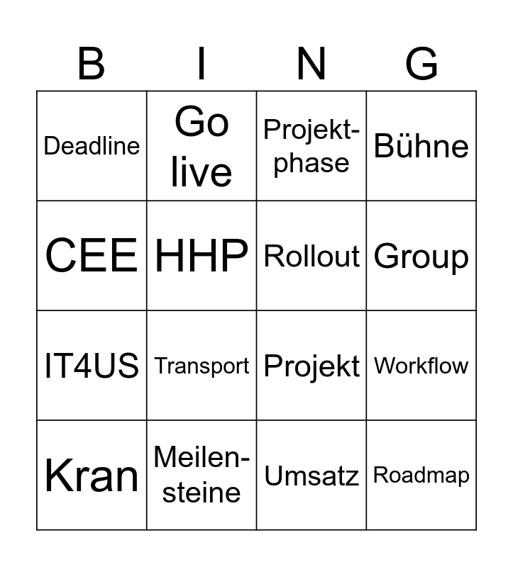 This bingo card has 16 words: Meilen-steine, Workflow, Projekt-phase, Deadline, IT4US, Go live, Projekt, Umsatz, CEE, HHP, Kran, Bühne, Transport, Group, Rollout and Roadmap.