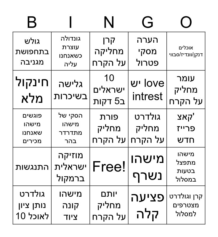 This bingo card has 26 words: Free!, פציעה קלה, 10 ישראלים ב5 דקות, מישהו קונה ציוד, אוכלים דנקן/וונדיז/סבווי, גולש בתחפושת מגניבה, חינקול מלא, גונדולה עוצרת כשאנחנו עליה, קאצ' פרייז חדש, מישהו נשרף, יש love intrest, פוגשים מישהו שאנחנו מכירים, מישהו מתפצל בטעות במסלול, גולדרט נותן ציון 10 לאוכל, הסקי של מישהו מתדרדר בהר, נפילה מביכה בגונדולה/t bar, הערה מסקי פטרול, התנגשות, קרן מחליקה על הקרח, פורת מחליק על הקרח, עומר מחליק על הקרח, יותם מחליק על הקרח, גולדרט מחליק על הקרח, מוזיקה ישראלית ברמקול, גלישה בשיכרות and קרן וגולדרט מצטרפים למסלול.