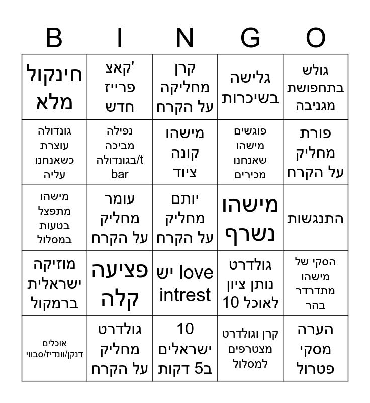 This bingo card has 25 words: פציעה קלה, 10 ישראלים ב5 דקות, מישהו קונה ציוד, אוכלים דנקן/וונדיז/סבווי, גולש בתחפושת מגניבה, חינקול מלא, גונדולה עוצרת כשאנחנו עליה, קאצ' פרייז חדש, מישהו נשרף, יש love intrest, פוגשים מישהו שאנחנו מכירים, מישהו מתפצל בטעות במסלול, גולדרט נותן ציון 10 לאוכל, הסקי של מישהו מתדרדר בהר, נפילה מביכה בגונדולה/t bar, הערה מסקי פטרול, התנגשות, קרן מחליקה על הקרח, פורת מחליק על הקרח, עומר מחליק על הקרח, יותם מחליק על הקרח, גולדרט מחליק על הקרח, מוזיקה ישראלית ברמקול, גלישה בשיכרות and קרן וגולדרט מצטרפים למסלול.