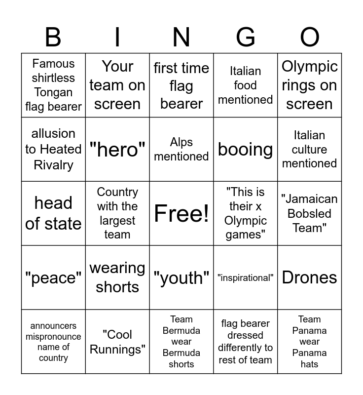 This bingo card has a free space and 29 words: announcers mispronounce name of country, Country with the smallest team, Country with the largest team, Country making first ever appearance at winter games, Famous shirtless Tongan flag bearer, first time flag bearer, "hero", wearing shorts, "This is their x Olympic games", "Cool Runnings", "Jamaican Bobsled Team", Team Panama wear Panama hats, Team Bermuda wear Bermuda shorts, flag bearer dressed differently to rest of team, Italian culture mentioned, Team with a single athlete, "youth", "peace", Olympic rings on screen, head of state, "inspirational", opera, booing, allusion to Heated Rivalry, Italian food mentioned, Your team on screen, Drones, Alps mentioned and Awkward malfunction.