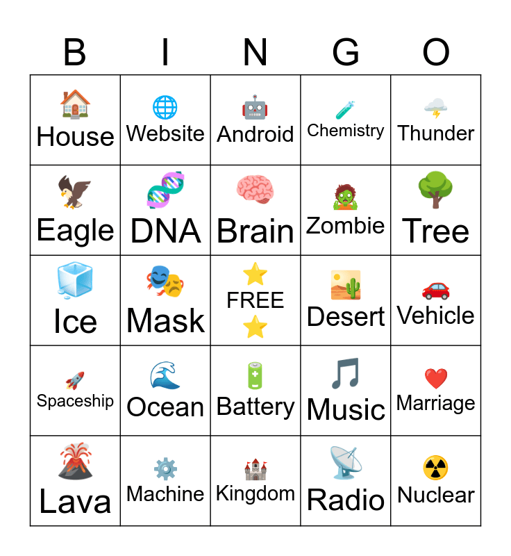 This bingo card has a free space and 24 words: ๐ Ocean, โ๏ธ Machine, ๐ง Brain, ๐ Lava, ๐ฉ๏ธ Thunder, ๐ House, ๐ฆ Eagle, ๐ Website, ๐๏ธ Desert, ๐ Battery, ๐ง Zombie, ๐ง Ice, ๐ต Music, โค๏ธ Marriage, ๐งฌ DNA, ๐ก Radio, ๐ Vehicle, ๐ค Android, ๐ณ Tree, ๐ญ Mask, โข๏ธ Nuclear, ๐ Spaceship, ๐งช Chemistry and ๐ฐ Kingdom.