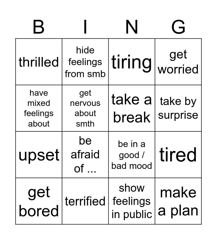 This bingo card has 16 words: terrified, tired, tiring, thrilled, upset, hide feelings from smb, be in a good / bad mood, show feelings in public, have mixed feelings about, get nervous about smth, get bored, get worried, be afraid of ..., take by surprise, take a break and make a plan.