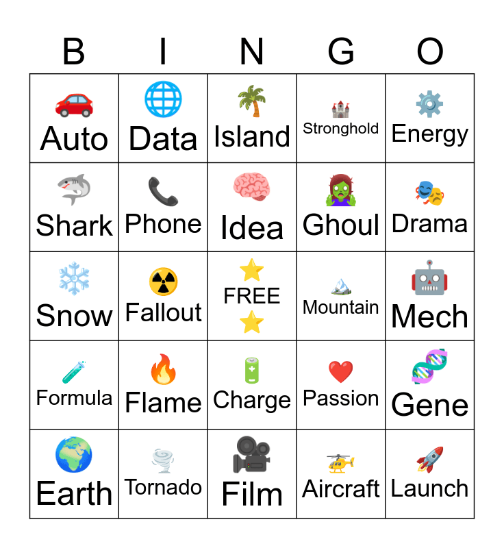 This bingo card has a free space and 24 words: ๐ฅ Flame, ๐ช๏ธ Tornado, ๐ง Idea, ๐ Earth, โ๏ธ Energy, ๐ Auto, ๐ฆ Shark, ๐ Data, ๐๏ธ Mountain, ๐ Charge, ๐งโโ๏ธ Ghoul, โ๏ธ Snow, โค๏ธ Passion, ๐งฌ Gene, ๐ Phone, ๐ Aircraft, ๐ค Mech, ๐ด Island, ๐ญ Drama, โข๏ธ Fallout, ๐ Launch, ๐งช Formula, ๐ฐ Stronghold and ๐ฅ Film.