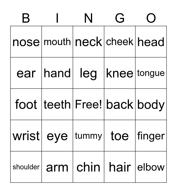 This bingo card has a free space and 24 words: eye, arm, leg, shoulder, head, nose, ear, mouth, back, tummy, knee, foot, toe, finger, hand, hair, body, neck, tongue, teeth, elbow, wrist, cheek and chin.