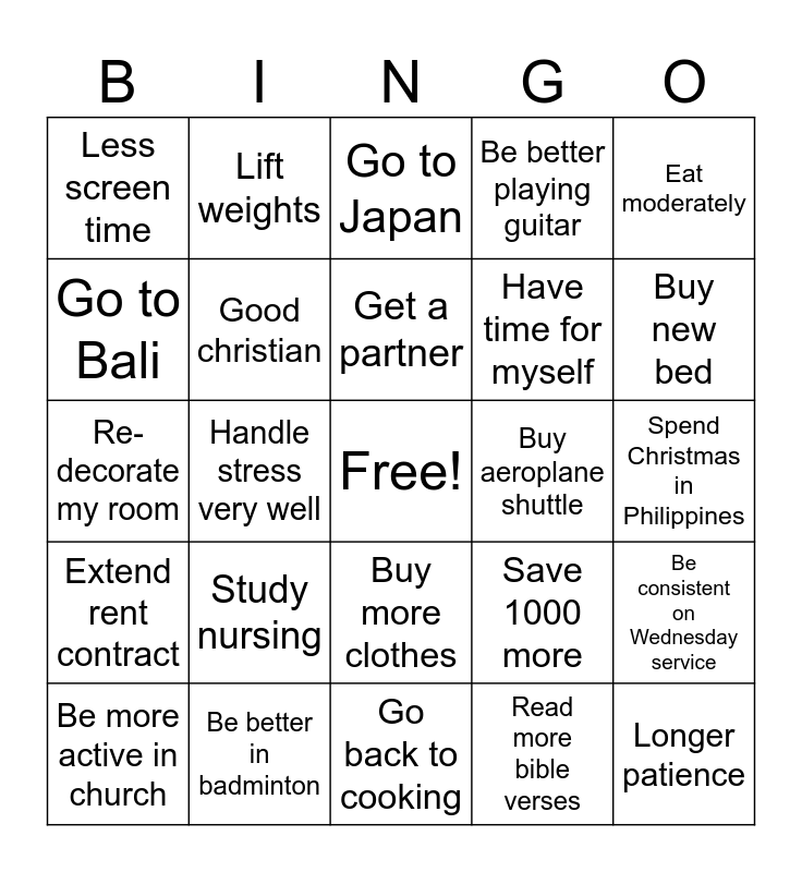 This bingo card has a free space and 24 words: Study nursing, Be better in badminton, Get a partner, Be more active in church, Eat moderately, Less screen time, Go to Bali, Lift weights, Buy aeroplane shuttle, Buy more clothes, Have time for myself, Re-decorate my room, Save 1000 more, Be consistent on Wednesday service, Good christian, Read more bible verses, Spend Christmas in Philippines, Go to Japan, Buy new bed, Handle stress very well, Longer patience, Extend rent contract, Be better playing guitar and Go back to cooking.
