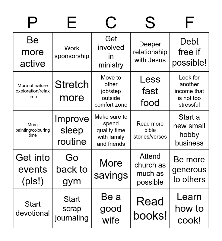 This bingo card has a free space and 24 words: Go back to gym, Start scrap journaling, Move to other job/step outside comfort zone, Start devotional, Debt free if possible!, Be more active, More of nature exploration/relax time, Work sponsorship, Read more bible stories/verses, More savings, Less fast food, More painting/colouring time, Attend church as much as possible, Be more generous to others, Stretch more, Read books!, Start a new small hobby business, Get involved in ministry, Look for another income that is not too stressful, Improve sleep routine, Learn how to cook!, Get into events (pls!), Deeper relationship with Jesus and Be a good wife.