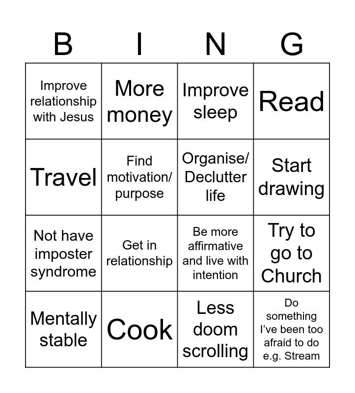 This bingo card has 19 words: Full-time Job/New job, Cook, Improve sleep, Try to go to Church, Get healthy, More money, Less doom scrolling, Read, Improve relationship with Jesus, Find motivation/ purpose, Organise/ Declutter life, Start drawing, Not have imposter syndrome, Get in relationship, Be more affirmative and live with intention, Do something I’ve been too afraid to do e.g. Stream, Travel, Mentally stable and More income avenues.