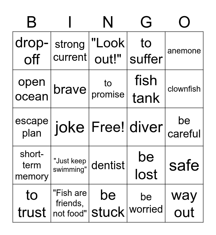 This bingo card has a free space and 24 words: "Just keep swimming", "Fish are friends, not food", to promise, to trust, anemone, drop-off, open ocean, strong current, diver, dentist, fish tank, escape plan, be lost, safe, brave, be worried, be careful, "Look out!", clownfish, joke, way out, short-term memory, to suffer and be stuck.