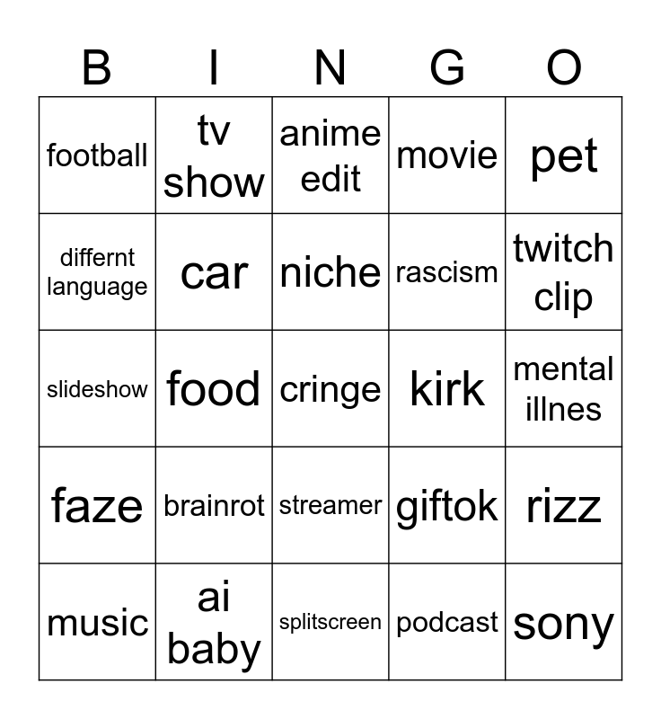 This bingo card has a free space and 29 words: music, gooner x 3, food, bball, football, anime edit, car, brainrot, kirk, ai baby, mental illnes, sony, splitscreen, podcast, twitch clip, game, streamer, faze, pet, slideshow, giftok, dancing, rascism, differnt language, movie, tv show, rizz, niche and esdeekid.