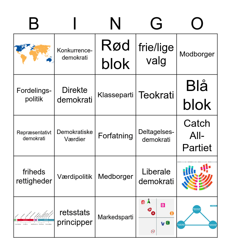 This bingo card has 5 images and 20 words: Værdipolitik, Markedsparti, Klasseparti, Modborger, Fordelings- politik, Konkurrence- demokrati, Deltagelses- demokrati, Medborger, Teokrati, Repræsentativt demokrati, Liberale demokrati, Direkte demokrati, Catch All-Partiet, Rød blok, Blå blok, Demokratiske Værdier, Forfatning, retsstats principper, friheds rettigheder and frie/lige valg.
