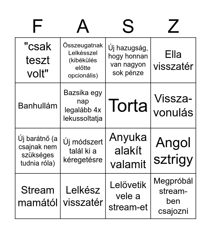 This bingo card has 16 words: Lelkész visszatér, Angol sztrigy, Új hazugság, hogy honnan van nagyon sok pénze, "csak teszt volt", Új barátnő (a csajnak nem szükséges tudnia róla), Összeugatnak Lelkésszel (kibékülés előtte opcionális), Anyuka alakít valamit, Lelövetik vele a stream-et, Banhullám, Bazsika egy nap legalább 4x lekussoltatja, Stream mamától, Ella visszatér, Új módszert talál ki a kéregetésre, Vissza- vonulás, Torta and Megpróbál stream-ben csajozni.