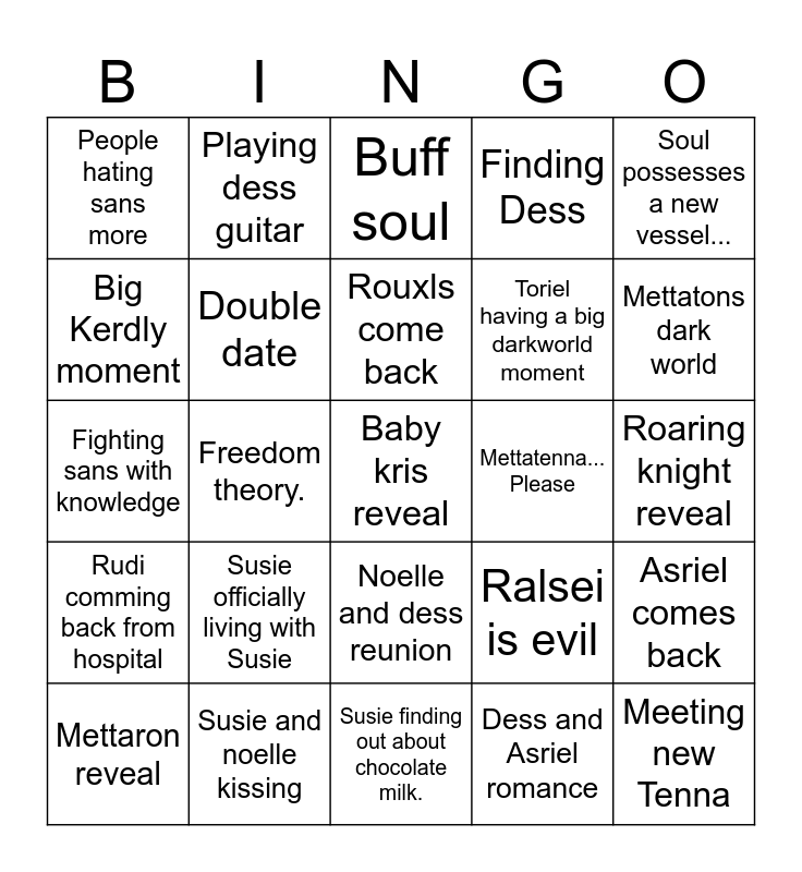 This bingo card has a free space and 24 words: Susie officially living with Susie, Susie and noelle kissing, Rouxls come back, Mettaron reveal, Soul possesses a new vessel..., People hating sans more, Big Kerdly moment, Playing dess guitar, Mettatenna... Please, Noelle and dess reunion, Toriel having a big darkworld moment, Fighting sans with knowledge, Ralsei is evil, Asriel comes back, Double date, Dess and Asriel romance, Roaring knight reveal, Buff soul, Mettatons dark world, Freedom theory., Meeting new Tenna, Rudi comming back from hospital, Finding Dess and Susie finding out about chocolate milk..
