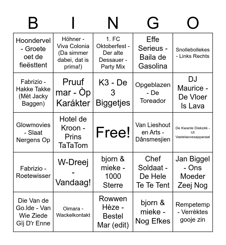 This bingo card has a free space and 40 words: De Panda - De Panda Groove, Glowmovies - Slaat Nergens Op, Gerard Van Veenendaal - De Niers, Pruuf mar - Òp Karákter, Oimara - Wackelkontakt, bjorn & mieke - 1000 Sterre, K3 - De 3 Biggetjes, Van Lieshout en Arts - Ik Wooj Nie Gaon, Snollebollekes - Links Rechts, Fabrizio - Roetewisser, Hotel de Kroon - Prins TaTaTom, Effe Serieus - Baila de Gasolina, Rempetemp - Verrèktes gooje zin, De Kwante Diekzèk - Ut Vastelaovesapparaat, Van Lieshout en Arts - Dânsmesjien, W-Dreej - Vandaag!, John Tana - De Kantine, Hoondervel - Groete oet de fieësttent, La Bamba - Laef, Limburg laef, 1. FC Oktoberfest - Der alte Dessauer - Party Mix, Jan Biggel - Ons Moeder Zeej Nog, bjorn & mieke - Nog Efkes, Opgeblazen - De Toreador, Fabrizio - Hakke Takke (Mèt Jacky Baggen), de toddezek - Heej blief ik plekke, Anton - Anton aus Tirol, Snollebollekes - Springen Nondeju, Lex Uiting - Nao ’t Zuuje, Feestteam - Stuiterbal, Feestteam - De Hele Tent Gaat Als Een Jojo, bjorn & mieke - Droeëme Mit De Oeëge Oop, Die Van de Go.lde - Van Wie Ziede Gïj D'r Enne, Sven Versteeg - Blikkendag, Chef Soldaat - De Hele Te Te Tent, DJ Maurice - De Vloer Is Lava, Rowwen Hèze - Bestel Mar (edit), Beppie Kraft - In d'n hiemel, Feestteam - Shirt Uit & Zwaaien, Höhner - Viva Colonia (Da simmer dabei, dat is prima!) and Frans Theunisz - Roed geel en greun.