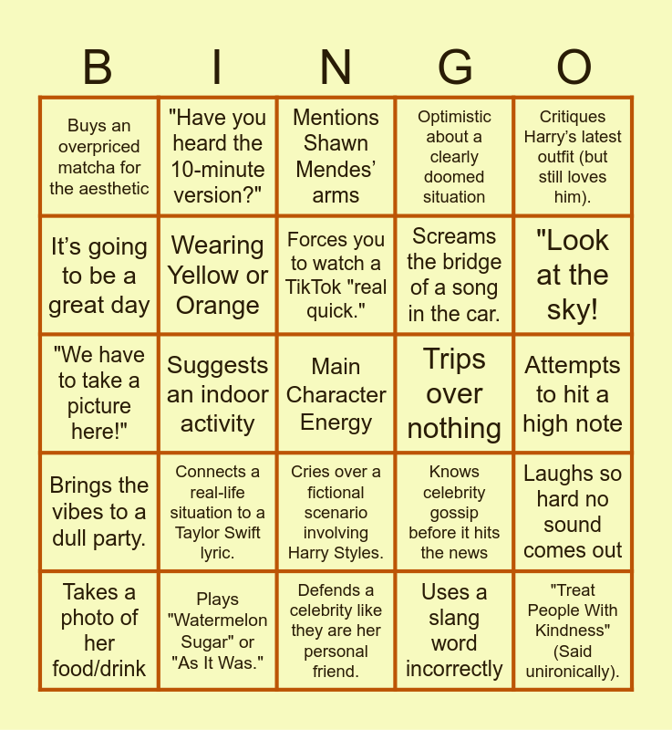 This bingo card has a free space and 24 words: Connects a real-life situation to a Taylor Swift lyric., Plays "Watermelon Sugar" or "As It Was.", Forces you to watch a TikTok "real quick.", Takes a photo of her food/drink, Critiques Harry’s latest outfit (but still loves him)., Buys an overpriced matcha for the aesthetic, It’s going to be a great day, "Have you heard the 10-minute version?", Trips over nothing, Cries over a fictional scenario involving Harry Styles., Screams the bridge of a song in the car., "We have to take a picture here!", Knows celebrity gossip before it hits the news, Laughs so hard no sound comes out, Wearing Yellow or Orange, Uses a slang word incorrectly, Attempts to hit a high note, Mentions Shawn Mendes’ arms, "Look at the sky!, Suggests an indoor activity, "Treat People With Kindness" (Said unironically)., Brings the vibes to a dull party., Optimistic about a clearly doomed situation and Defends a celebrity like they are her personal friend..