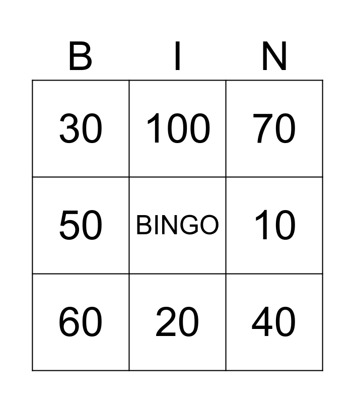 This bingo card has a free space and 8 words: 10, 70, 100, 60, 30, 40, 50 and 20.