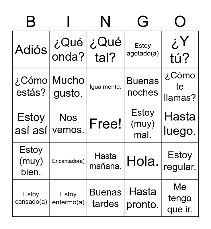 This bingo card has a free space and 27 words: Hola., Buenos días, Buenas noches, Buenas tardes, ¿Cómo estás?, ¿Qué tal?, ¿Qué onda?, Estoy (muy) bien., Estoy (muy) mal., Estoy regular., Estoy así así, Estoy agotado(a), Estoy cansado(a), Estoy enfermo(a), ¿Cómo te llamas?, Me llamo..., Mucho gusto., Igualmente., Encantado(a), Adiós, Hasta luego., Hasta pronto., Nos vemos., Me tengo que ir., Hasta mañana., ¿Y tú? and ¿Y usted?.