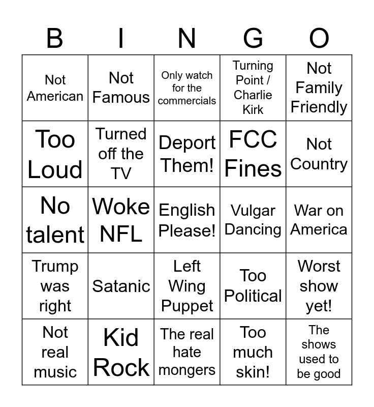 This bingo card has a free space and 24 words: Satanic, Kid Rock, Deport Them!, Not real music, Not Family Friendly, Not American, Too Loud, Not Famous, Vulgar Dancing, Left Wing Puppet, FCC Fines, No talent, Too Political, Worst show yet!, Turned off the TV, Too much skin!, War on America, Only watch for the commercials, Not Country, Woke NFL, The shows used to be good, Trump was right, Turning Point / Charlie Kirk and The real hate mongers.