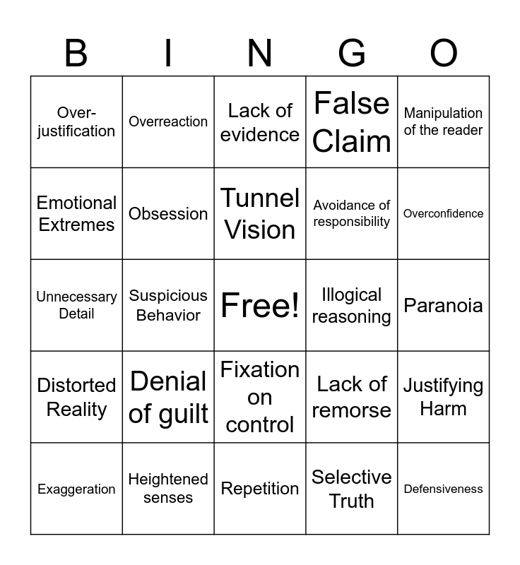 This bingo card has a free space and 29 words: Exaggeration, Emotional Language, Suspicious Behavior, Contradiction, Over-justification, Lack of evidence, Obsession, Denial of guilt, Illogical reasoning, Heightened senses, Paranoia, Defensiveness, Repetition, Selective Truth, Overconfidence, Unstable tone, Fixation on control, Distorted Reality, Manipulation of the reader, Unnecessary Detail, Lack of remorse, Self-praise, Avoidance of responsibility, Emotional Extremes, False Claim, Overreaction, Justifying Harm, Tunnel Vision and Misplaced Pride.