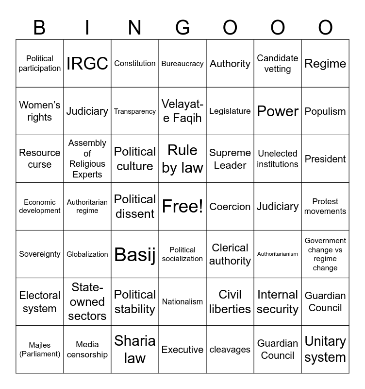 This bingo card has a free space and 63 words: Theocracy, Authoritarian regime, Legitimacy, Rule by law, Supreme Leader, Guardian Council, Regime, Regime change, Assembly of Religious Experts, Sharia law, Velayat-e Faqih, Clerical authority, Unelected institutions, President, Majles (Parliament), Judiciary, Constitution, Bureaucracy, Civil service, Candidate vetting, Guardian Council, Political participation, IRGC, Basij, Hardliners vs Reformers, Coercion, Internal security, Rentier state, Resource curse, State-owned sectors, Corruption, Economic inequality, Civil liberties, Civil society, Protest movements, Women’s rights, Media censorship, Political dissent, Nationalism, Authority, Power, Government change vs regime change, Sovereignty, Accountability, Transparency, Executive, Legislature, Judiciary, Unitary system, Electoral system, Political parties, Political culture, Political socialization, cleavages, Nationalism, Populism, Economic development, Globalization, Political stability, Fragile State Index, Democratization, Authoritarianism and Reform.