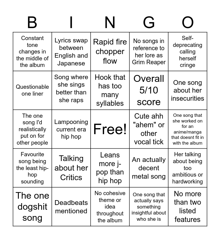 This bingo card has a free space and 24 words: Talking about her Critics, Deadbeats mentioned, Hook that has too many syllables, The one dogshit song, Self-deprecating calling herself cringe, Constant tone changes in the middle of the album, Questionable one liner, Lyrics swap between English and Japanese, Cute ahh "ahem" or other vocal tick, Leans more j-pop than hip hop, Overall 5/10 score, The one song I'd realistically put on for other people, An actually decent metal song, Her talking about being too ambitious or hardworking, Song where she sings better than she raps, One song that actually says something insightful about who she is, One song that she worked on for an anime/manga that doesnt fit in with the album, Rapid fire chopper flow, One song about her insecurities, Lampooning current era hip hop, No more than two listed features, Favourite song being the least hip-hop sounding, No songs in reference to her lore as Grim Reaper and No cohesive theme or idea throughout the album.