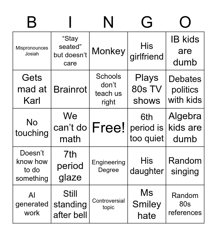 This bingo card has a free space and 32 words: Ms Smiley hate, On his phone in class, We can’t do math, “I probably shouldn’t be telling you this but…”, Doesn’t know how to do something, Brainrot, IB kids are dumb, Random singing, “Stay seated” but doesn’t care, Friday mention, Schools don’t teach us right, Monkey, Lebron, Stinky classroom, 6th period is too quiet, Used to not use calculators, AI generated work, No touching, Engineering Degree, 7th period glaze, His daughter, Threaten referrals, Algebra kids are dumb, Still standing after bell, Random 80s references, His girlfriend, Plays 80s TV shows, Gets mad at Karl, Mispronounces Josiah, Controversial topic, Minor racism and Debates politics with kids.