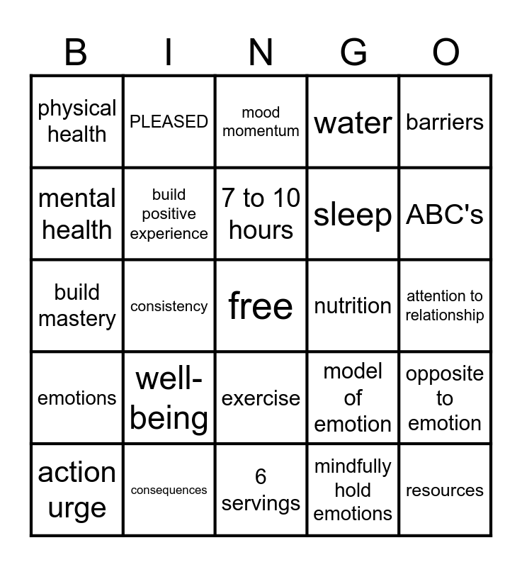This bingo card has a free space and 24 words: well-being, consequences, 7 to 10 hours, action urge, barriers, physical health, mental health, PLEASED, nutrition, exercise, sleep, build mastery, model of emotion, opposite to emotion, build positive experience, mindfully hold emotions, attention to relationship, mood momentum, ABC's, consistency, resources, emotions, water and 6 servings.
