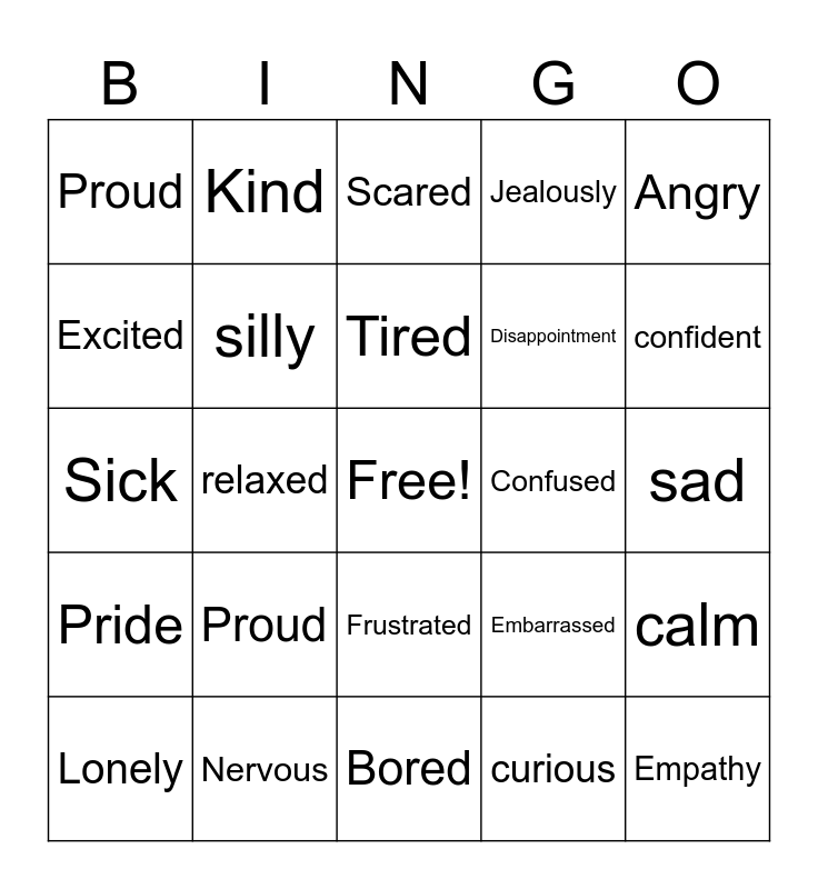 This bingo card has a free space and 24 words: Proud, Nervous, Tired, Lonely, Angry, Proud, Excited, Kind, Confused, Frustrated, Disappointment, Sick, Embarrassed, calm, silly, curious, sad, Scared, confident, relaxed, Empathy, Pride, Jealously and Bored.