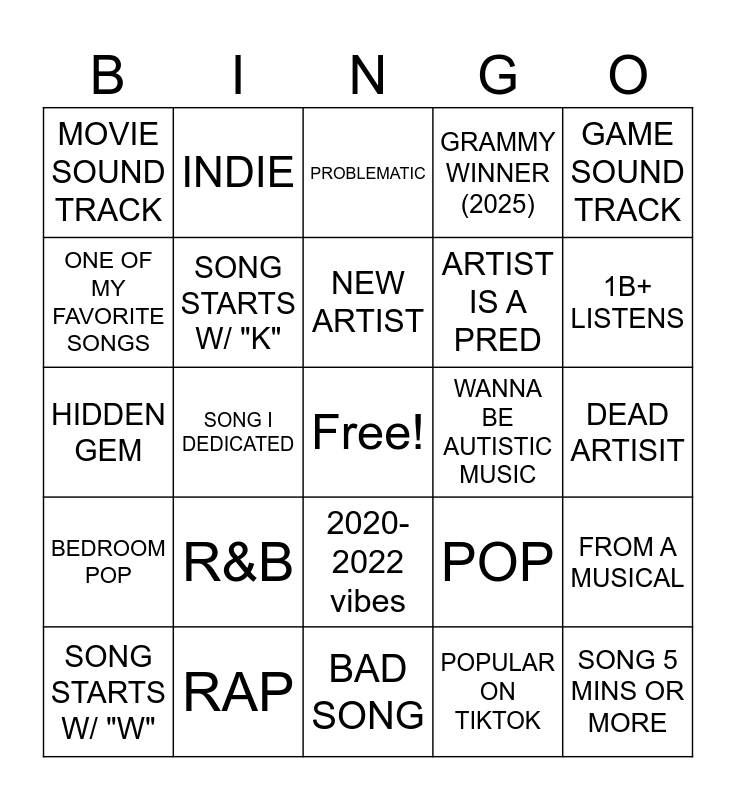 This bingo card has a free space and 24 words: R&B, RAP, NEW ARTIST, SONG STARTS W/ "W", GAME SOUND TRACK, MOVIE SOUND TRACK, ONE OF MY FAVORITE SONGS, INDIE, WANNA BE AUTISTIC MUSIC, 2020-2022 vibes, ARTIST IS A PRED, HIDDEN GEM, POP, FROM A MUSICAL, SONG STARTS W/ "K", POPULAR ON TIKTOK, DEAD ARTISIT, PROBLEMATIC, 1B+ LISTENS, SONG I DEDICATED, SONG 5 MINS OR MORE, BEDROOM POP, GRAMMY WINNER (2025) and BAD SONG.