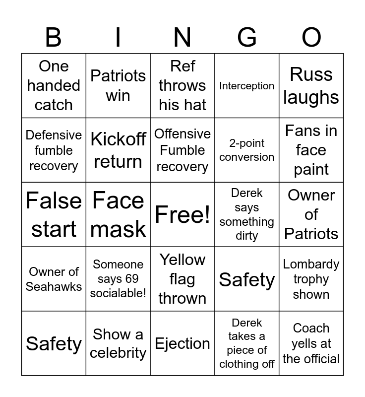 This bingo card has a free space and 45 words: Someone says 69 socialable!, Coach yells at the official, Ejection, Safety, Missed field goal, Derek takes a piece of clothing off, Ref throws his hat, Red flag thrown, Russ laughs, Show a celebrity, Interception, Derek says something dirty, Yellow flag thrown, Someone says 69 socialable!, Coach yells at the official, Ejection, Safety, False start, Puppy commercial, Fans in face paint, Patriots win, Seahawks win, 4th down conversion, One handed catch, Shirtless fan, Owner of Patriots, Coach yells at the official, Ejection, Safety, Owner of Seahawks, Diving catch, Lombardy trophy shown, TNC phone rings, Order a drink with an accent, Someone comes in on snowmobile, Face mask, Offense holding, Defense holding, Pick 6, Offensive Fumble recovery, Defensive fumble recovery, 2-point conversion, First fight, Kickoff return and Lexi talks about her husband.