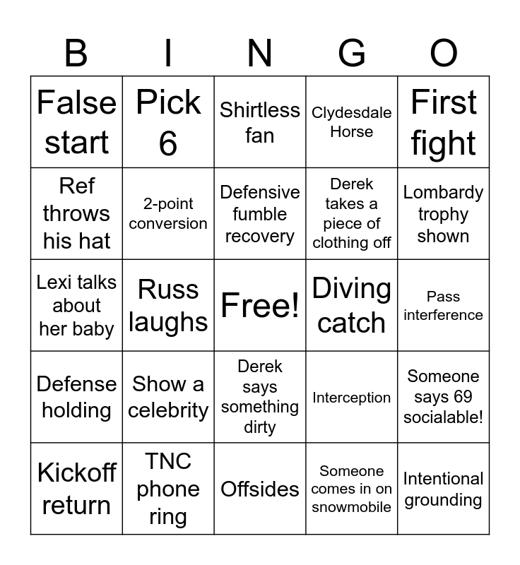 This bingo card has a free space and 34 words: Order a drink with an accent, Someone comes in on snowmobile, Face mask, Offense holding, Defense holding, 2-point conversion, First fight, Kickoff return, Pick 6, Offensive Fumble recovery, Defensive fumble recovery, Shirtless fan, Owner of Patriots, Owner of Seahawks, Diving catch, Lombardy trophy shown, TNC phone ring, Lexi talks about her baby, Show a celebrity, Interception, Derek says something dirty, Yellow flag thrown, False start, Pass interference, Offsides, Intentional grounding, Clydesdale Horse, Puppy commercial, Derek takes a piece of clothing off, Ref throws his hat, Red flag thrown, Russ laughs, Someone says 69 socialable! and Missed field goal.