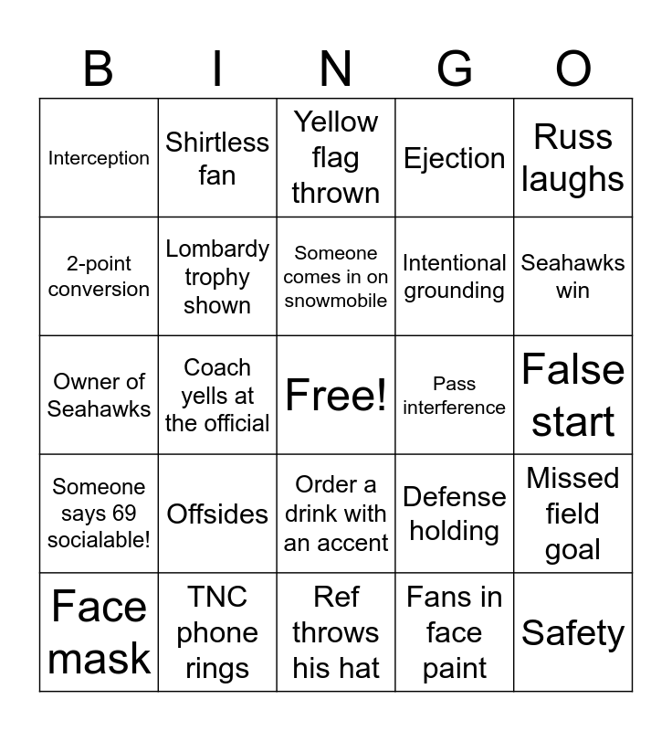 This bingo card has a free space and 41 words: Owner of Patriots, Owner of Seahawks, Diving catch, Lombardy trophy shown, TNC phone rings, Order a drink with an accent, Someone comes in on snowmobile, Red flag thrown, Russ laughs, Someone says 69 socialable!, Coach yells at the official, Ejection, Safety, False start, Pass interference, Offsides, Show a celebrity, Interception, Derek says something dirty, Yellow flag thrown, Missed field goal, Derek takes a piece of clothing off, Ref throws his hat, Intentional grounding, Clydesdale Horse, Puppy commercial, Fans in face paint, Patriots win, Seahawks win, 4th down conversion, One handed catch, Shirtless fan, Face mask, Offense holding, Defense holding, 2-point conversion, First fight, Kickoff return, Pick 6, Offensive Fumble recovery and Defensive fumble recovery.