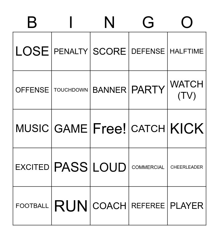 This bingo card has a free space and 29 words: FOOTBALL, TEAM, GAME, WIN, LOSE, SCORE, TOUCHDOWN, PASS, CATCH, RUN, KICK, PLAYER, COACH, REFEREE, WATCH (TV), CROWD, LOUD, EXCITED, HALFTIME, MUSIC, COMMERCIAL, FOOD, PARTY, OFFENSE, DEFENSE, PENALTY, CHEERLEADER, BANNER and JERSEY.