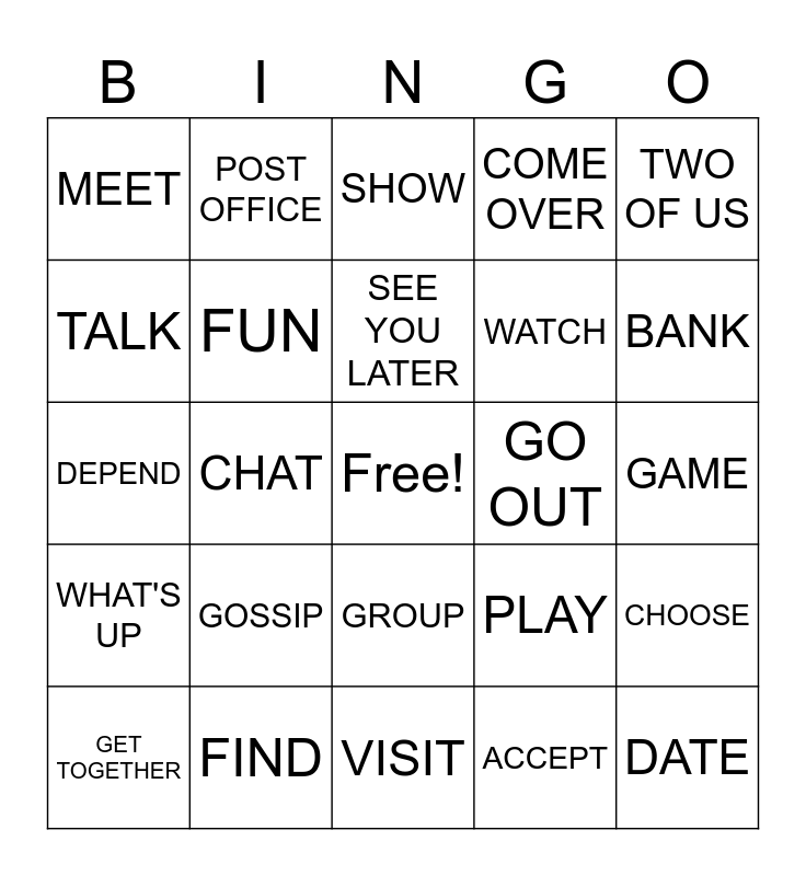 This bingo card has a free space and 39 words: BROKE, BUSY, FRIEND, FUN, GET TOGETHER, GROUP, SEE YOU LATER, THREE OF US, TWO OF US, WHAT'S UP, CHAT, COME OVER, DATE, GAME, GO OUT, GOSSIP, HANG OUT, MEET, PARTY, PLAY, TALK, VISIT, WATCH, BANK, COLLEGE, GAS STATION, LIBRARY, MOVIE THEATER, PARK, POST OFFICE, SCHOOL, BUILD, SHOW, FIND, ACCEPT, TRY, CHOOSE, DEPEND and PLAN.