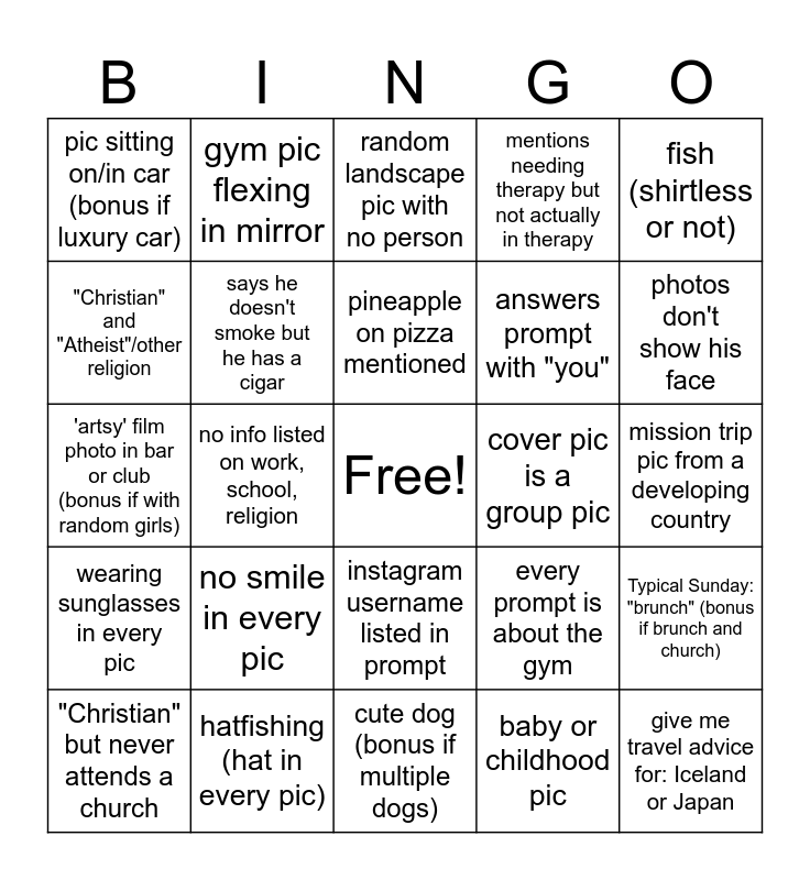 This bingo card has a free space and 24 words: no smile in every pic, hatfishing (hat in every pic), pineapple on pizza mentioned, "Christian" but never attends a church, fish (shirtless or not), pic sitting on/in car (bonus if luxury car), "Christian" and "Atheist"/other religion, gym pic flexing in mirror, cover pic is a group pic, instagram username listed in prompt, answers prompt with "you", 'artsy' film photo in bar or club (bonus if with random girls), every prompt is about the gym, Typical Sunday: "brunch" (bonus if brunch and church), says he doesn't smoke but he has a cigar, baby or childhood pic, mission trip pic from a developing country, random landscape pic with no person, photos don't show his face, no info listed on work, school, religion, give me travel advice for: Iceland or Japan, wearing sunglasses in every pic, mentions needing therapy but not actually in therapy and cute dog (bonus if multiple dogs).