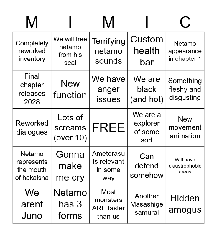 This bingo card has a free space and 24 words: Gonna make me cry, Netamo has 3 forms, We have anger issues, We arent Juno, Netamo appearance in chapter 1, Completely reworked inventory, Final chapter releases 2028, We will free netamo from his seal, We are a explorer of some sort, Ameterasu is relevant in some way, We are black (and hot), Reworked dialogues, Can defend somehow, Will have claustrophobic areas, New function, Another Masashige samurai, New movement animation, Terrifying netamo sounds, Something fleshy and disgusting, Lots of screams (over 10), Hidden amogus, Netamo represents the mouth of hakaisha, Custom health bar and Most monsters ARE faster than us.