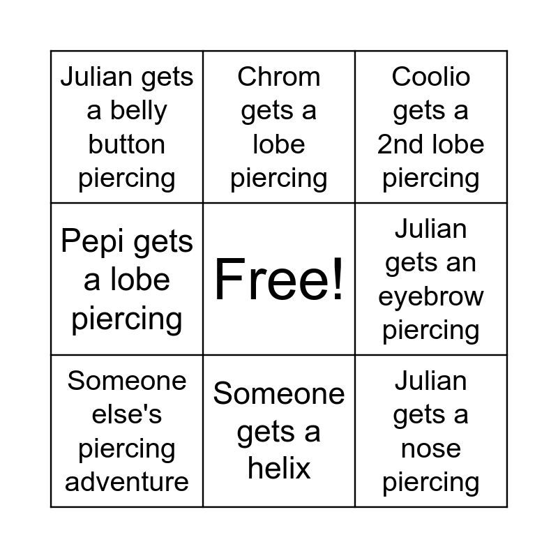 This bingo card has a free space and 8 words: Julian gets an eyebrow piercing, Coolio gets a 2nd lobe piercing, Chrom gets a lobe piercing, Someone else's piercing adventure, Julian gets a belly button piercing, Julian gets a nose piercing, Pepi gets a lobe piercing and Someone gets a helix.